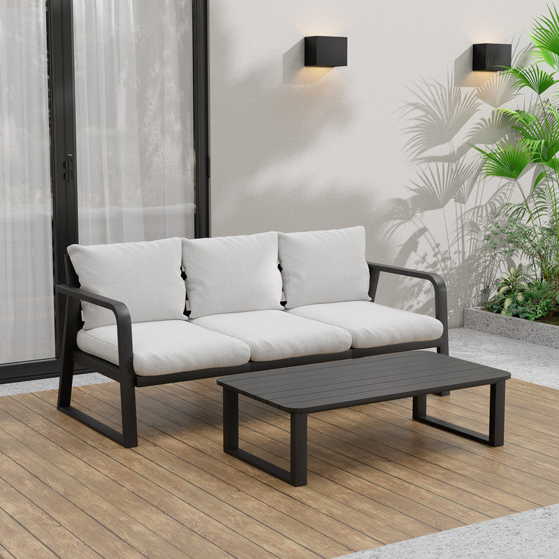 Introducing our Aluminum Patio 3-Person Sofa with Coffee Table - a perfect blend of style and durability, designed to elevate your outdoor experience throughout the year. Crafted with fashion-forward and premium materials, this set adds a touch of elegance to your patio decor. It includes a 3-person sofa and a coffee table, making it an ideal choice for sunrooms, gardens, balconies, and poolside areas. Made from high-quality matte black aluminum alloy, it boasts advantages such as sun resistance, waterproofness, rust resistance, insect resistance, and corrosion resistance, surpassing traditional wicker outdoor furniture in durability and aesthetic appeal. The 4-inch thick water-resistant seat cushions and soft back cushions provide a relaxed and comfortable seating experience. Easy to assemble and low maintenance, this set ensures you won't have to worry about cracks, splits, or aging. Create a comfortable and luxurious ambiance, enhancing your outdoor space with our premium aluminum patio conversation set.