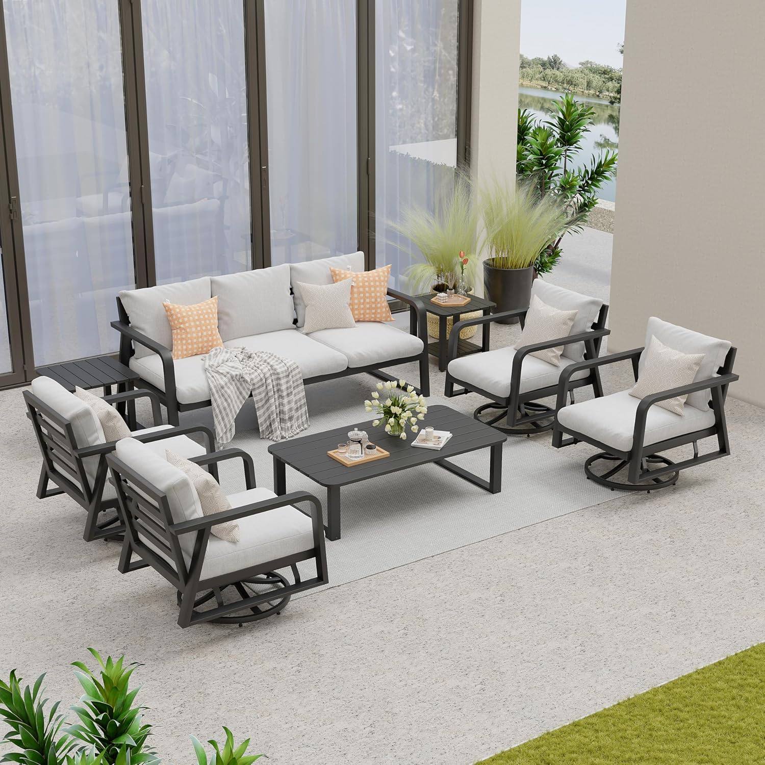 · Package Content: 1 outdoor aluminum 3-person sofa, 4 swivel rocking chairs, 2 side table, 1 coffee table. If you have any questions, please feel free to contact us. Our professional customer service team will provide you with satisfactory answers.